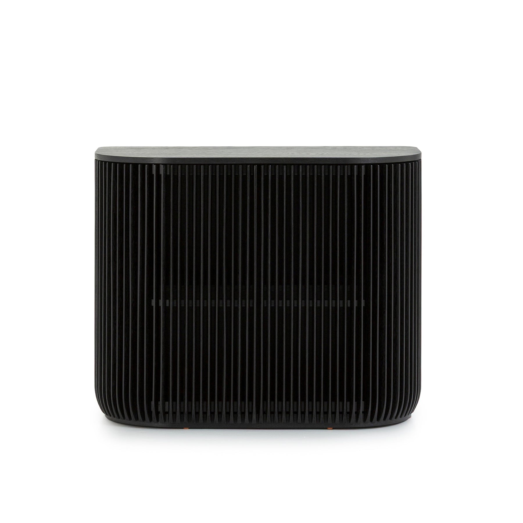 Meet your new storage hero—a substantial sideboard built to last. Crafted from engineered wood with oak veneer and finished in sophisticated black stain, this piece combines durability with design. The vertical slatted front and soft, rounded edges give it contemporary charm, while the compact footprint fits snugly into smaller rooms. Swing open the dual doors to reveal generous storage space. Elevated on a sleek base and arriving fully assembled, it's ready to anchor your space with style and substance.