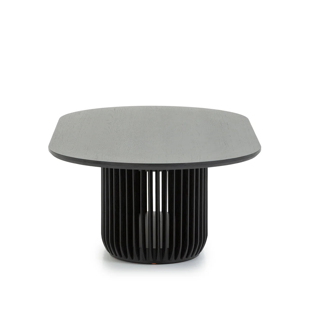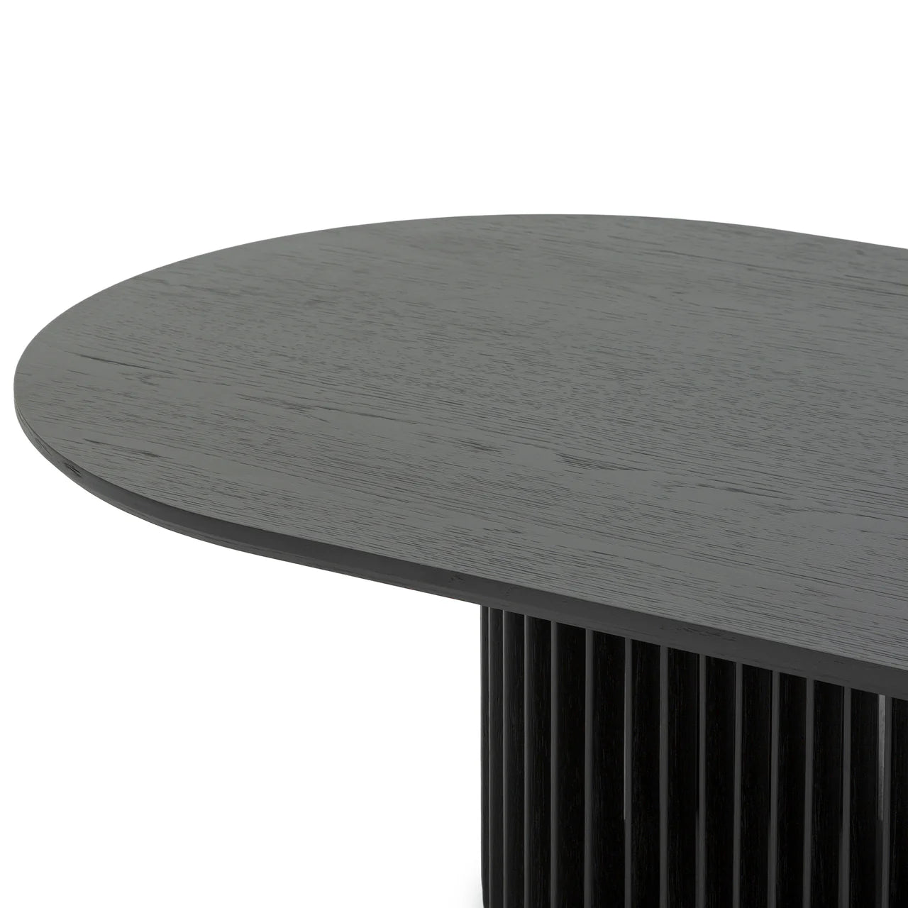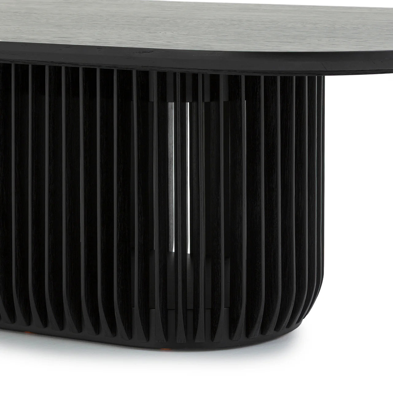 The Solace Oval Coffee Table brings effortless elegance to any living space. Crafted from engineered wood with a rich black stain oak veneer, this 1.3m beauty features a gracefully curved oval top and striking fluted pedestal base. Its symmetrical design and rounded edges create a sophisticated focal point, while the spacious surface keeps your essentials within arm's reach. Minimal assembly required.