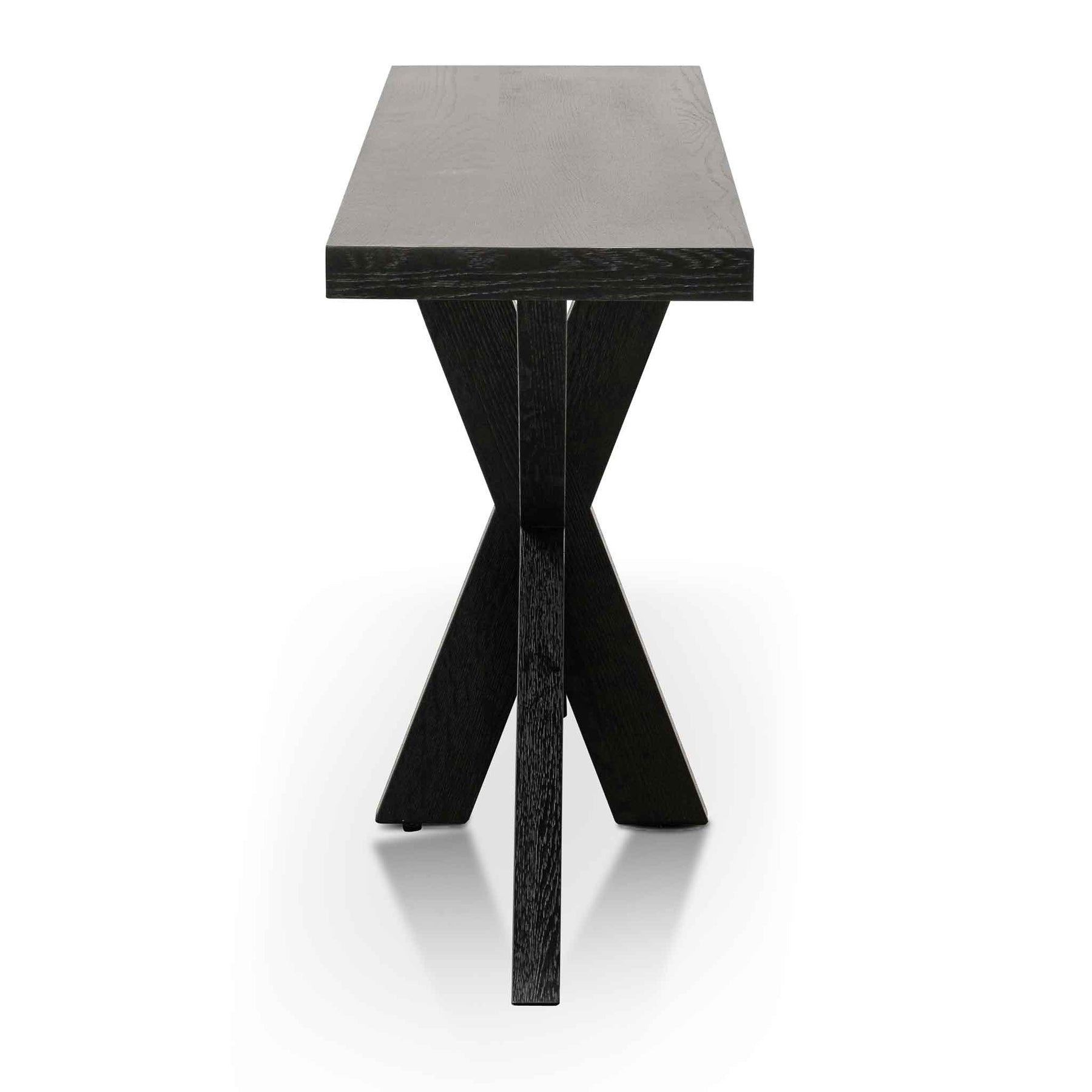 Sleek meets functional with this striking console table! Featuring engineered wood with black oak veneer, it boasts a bold textured espresso black finish that highlights natural wood character. The eye-catching X-cross base pairs perfectly with the linear tabletop design for contemporary style. At 1.6m, it's the ideal statement piece for entryways, living rooms, or home offices. Simple assembly required.