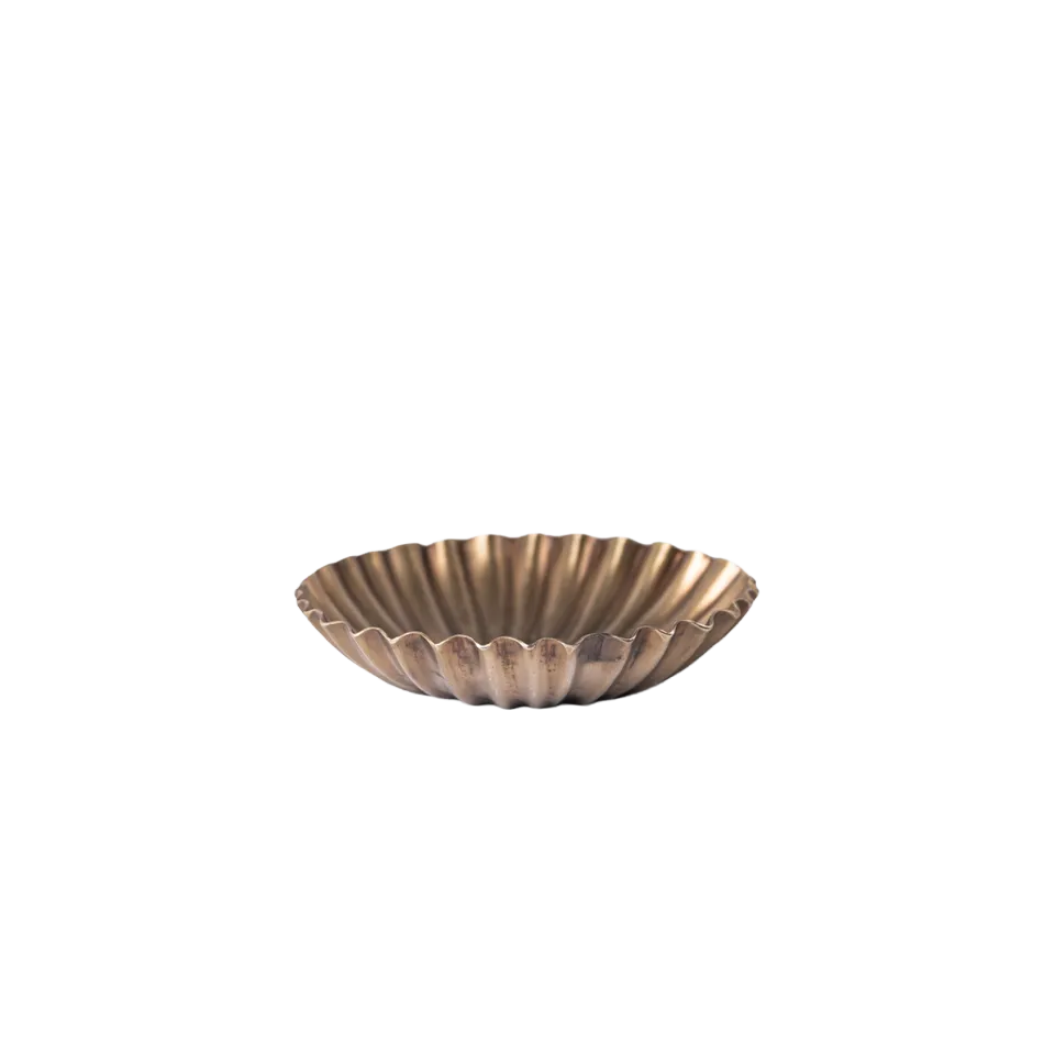 This petite iron dish features a charming scalloped edge and warm brass patina that catches the light beautifully. With its vintage-inspired fluted design and gently weathered finish, it's the perfect accent piece for adding character to shelves, tables, or anywhere you need a touch of understated elegance.